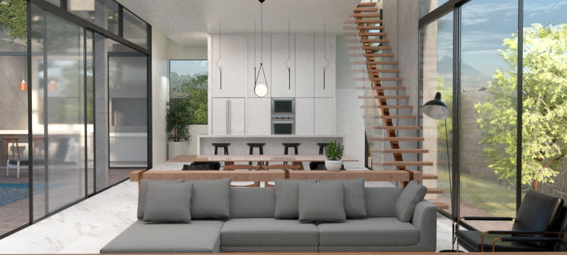An architecture house project in a private residential community. The concept of the project was to create a longitudinal, open floor plan to potentialize the visual permeability of the space.